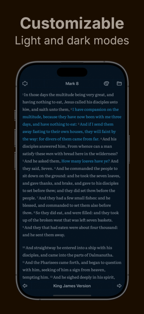 Immerse yourself in light and dark modes, carefully curated color schemes, and a thoughtfully designed experience where Scripture takes center stage.
